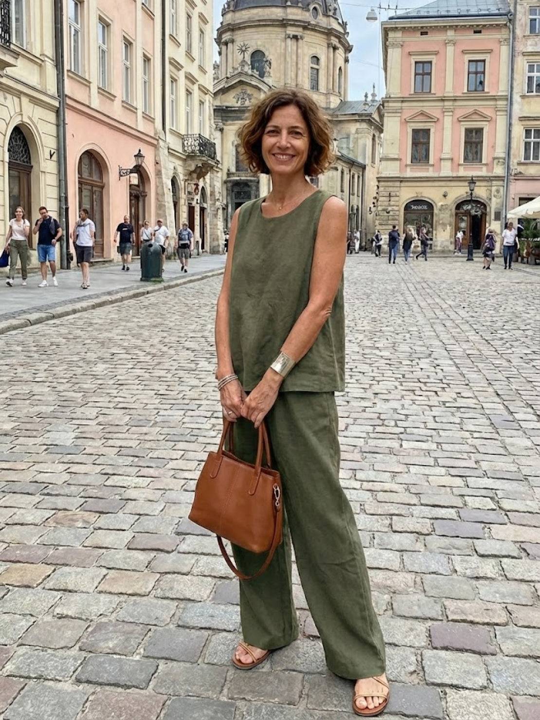 Olivia To-Delt Sæt kombinerer en afslappet ærmeløs tanktop med bukser med bred ben i en klar, tonet olivengrøn — en bekymringsfri kombination, der ser poleret ud uden ekstra indsats. Let og åndbar, dette matchende sæt er ideelt til varme forårs- og sommerdage, når du vil se velklædt ud fra det øjeblik, du træder ud af døren.
