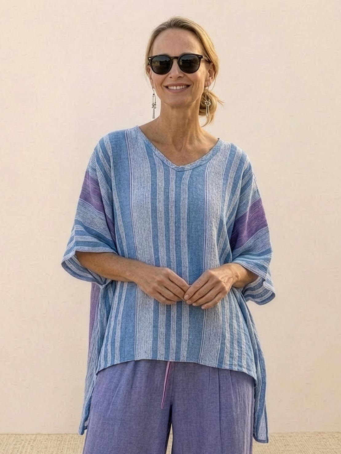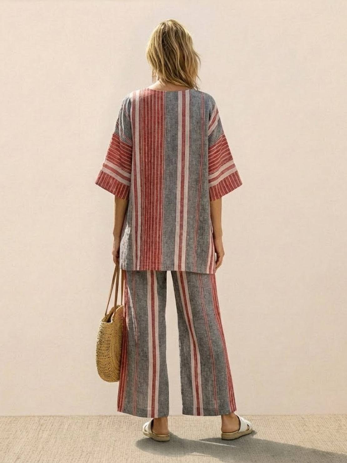 • Tonal co-ord sammensætning: De neutrale, jordnære nuancer af toppen og de stribede bukser arbejder sammen problemfrit som et sæt eller individuelt — miks hver del ind i din eksisterende garderobe for endnu flere outfitmuligheder.